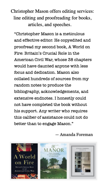Christopher Mason offers editing services: line editing and proofreading for books, articles, and speeches. Click for more.