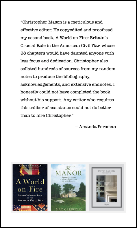 Christopher offers editing services: line editing, fact checking, and proofreading for books, articles, and speeches. Click for more.