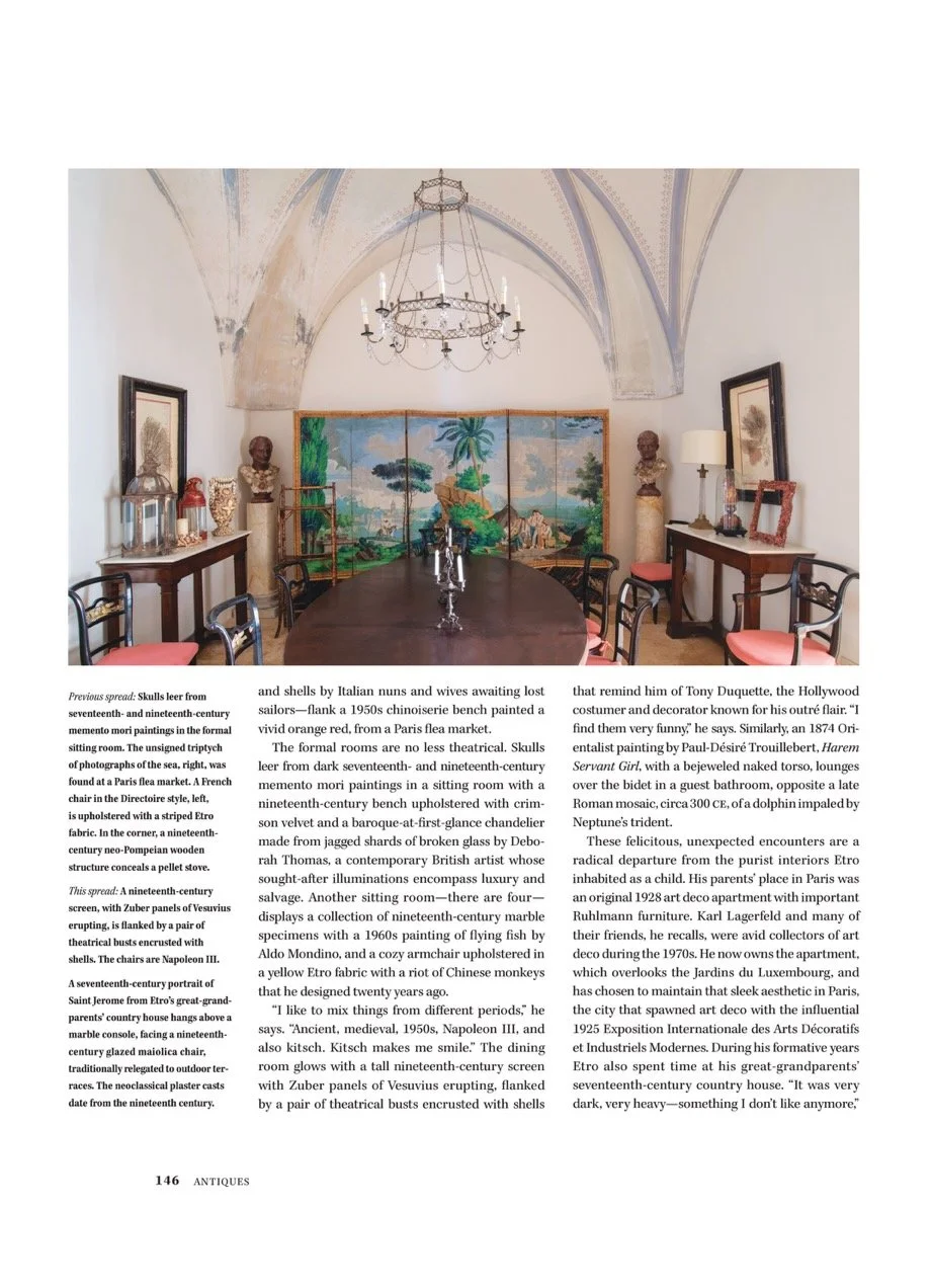 These felicitous, unexpected encounters are a radical departure from the purist interiors he inhabited as a child. His parents’ place in Paris was an original 1928 art deco apartment with important Ruhlmann furniture. Karl Lagerfeld and many of their friends, he recalls, were avid collectors of art deco during the 1970s. He now owns the apartment, which overlooks the Jardins du Luxembourg, and has chosen to maintain that sleek aesthetic in Paris, the city that spawned art deco with the influential 1925 Exposition Internationale des Arts Décoratifs et Industriels Modernes. During his formative years Etro also spent time at his great-grandparents’ seventeenth-century country house. “It was very dark, very heavy—something I don’t like anymore,” he says. “Not my style.” But he’s kept an heirloom from that ancestral house—a seventeenth-century portrait of Saint Jerome, painted on wood, which hangs above a marble console in Puglia.