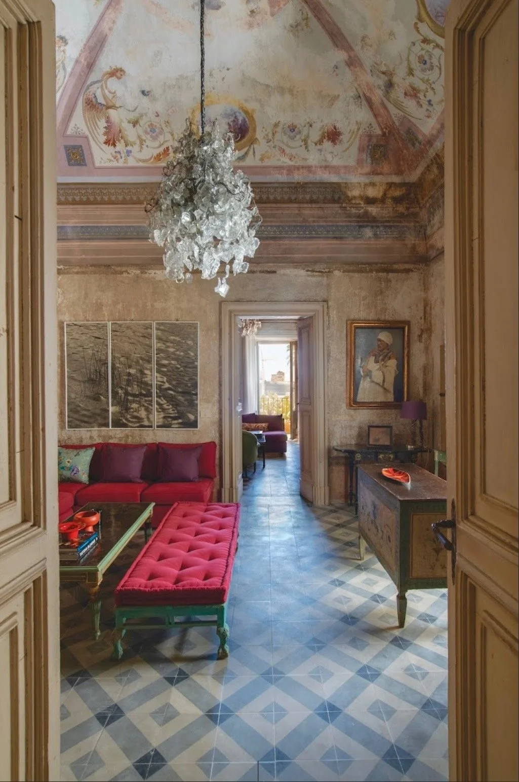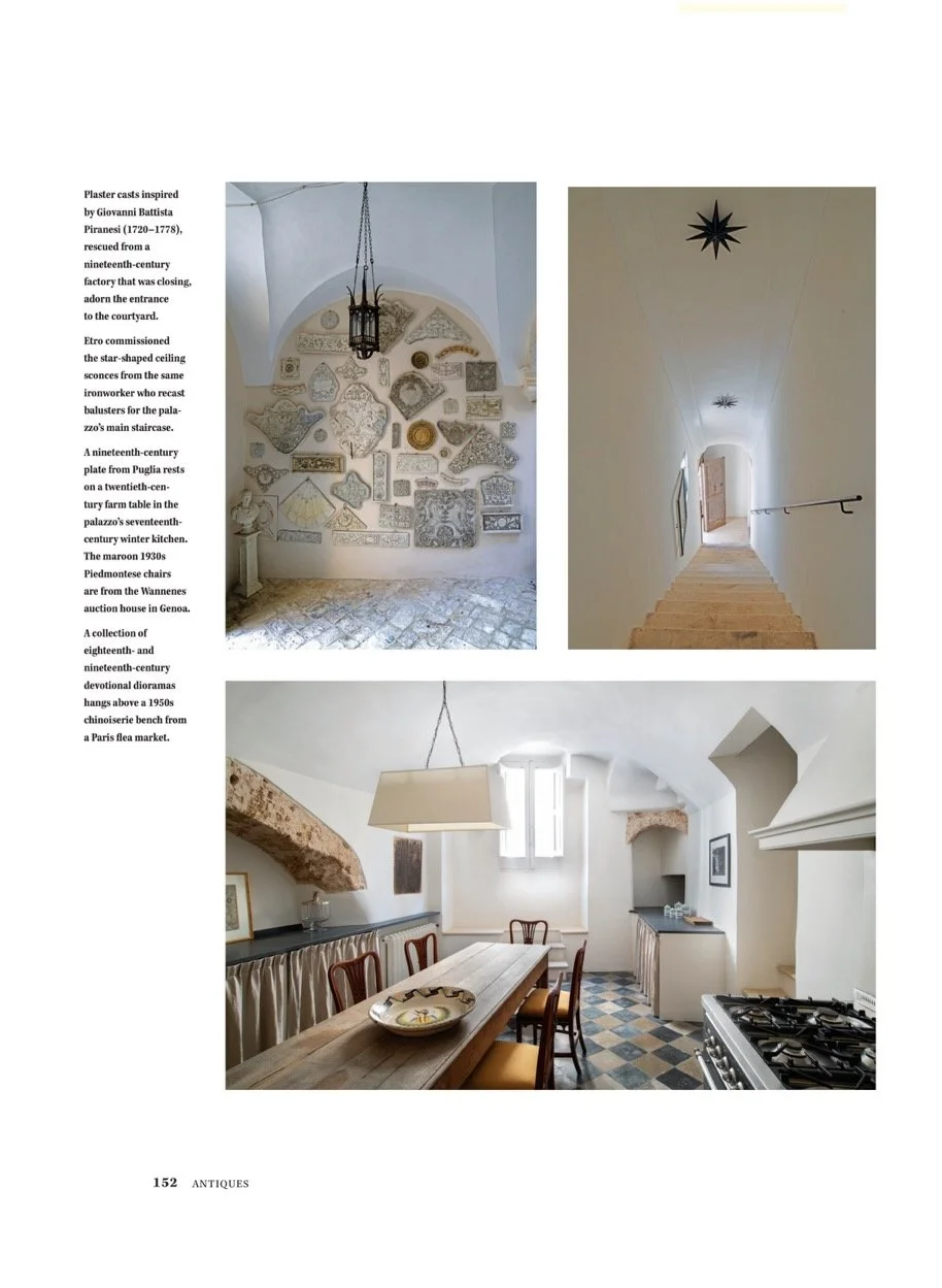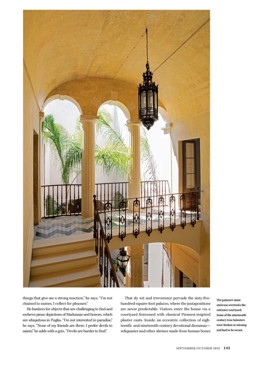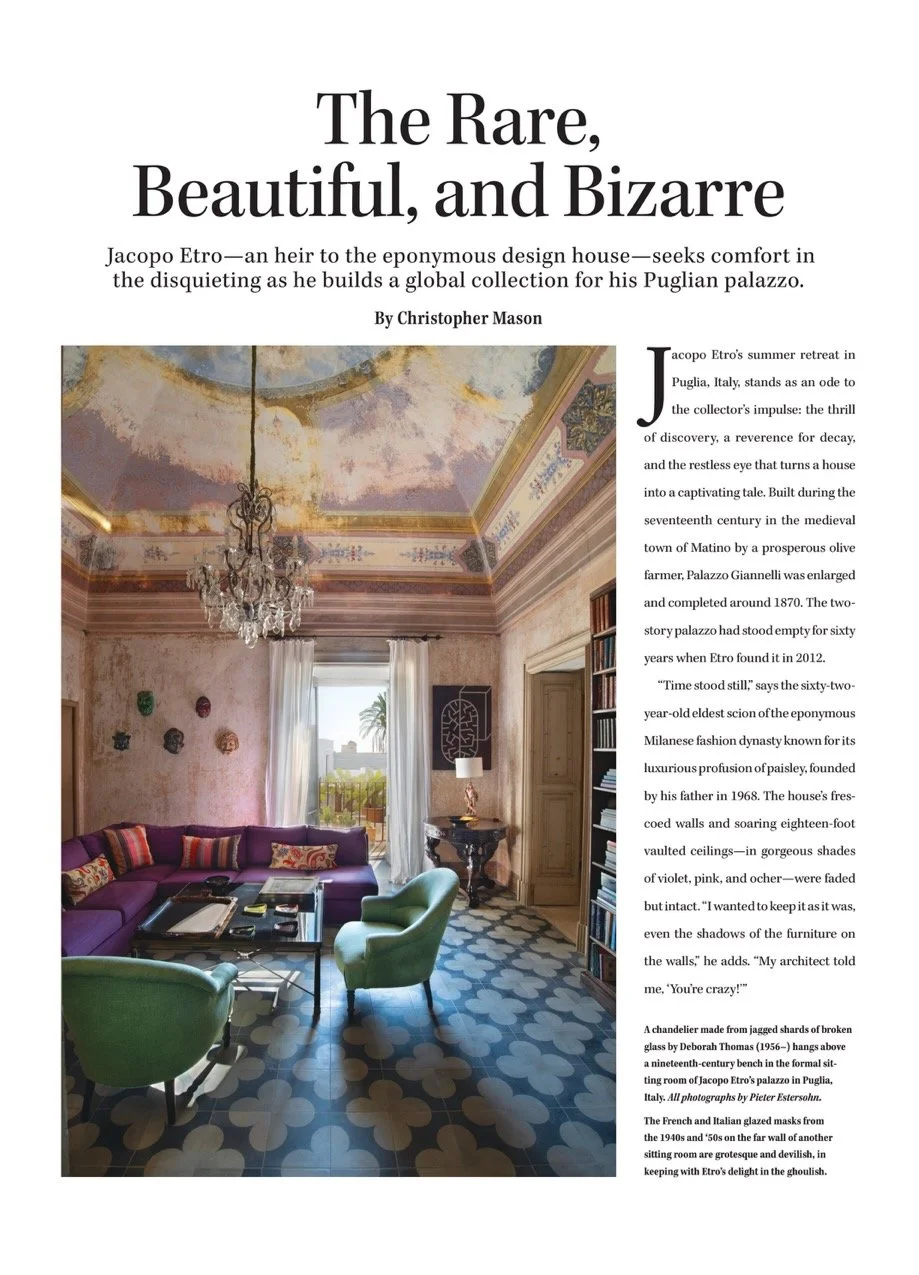 Jacopo Etro’s summer retreat in Puglia, Italy, stands as an ode to the collector’s impulse: the thrill of discovery, a reverence for decay, and the restless eye that turns a house into a captivating tale. Built during the seventeenth century in the medieval town of Matino by a prosperous olive farmer, Palazzo Giannelli was enlarged and completed around 1870. The two-story palazzo had stood empty for sixty years when he found it in 2012.