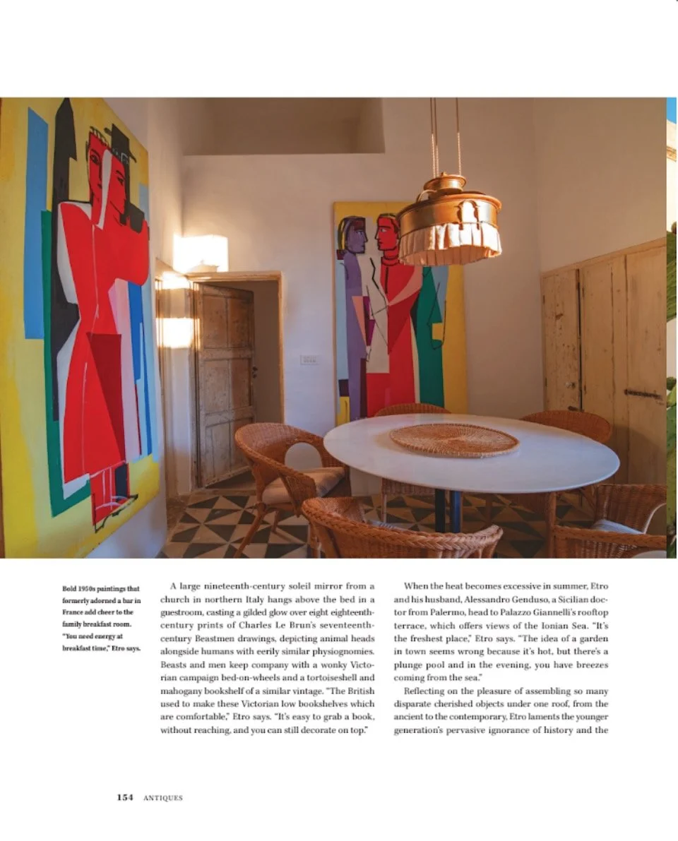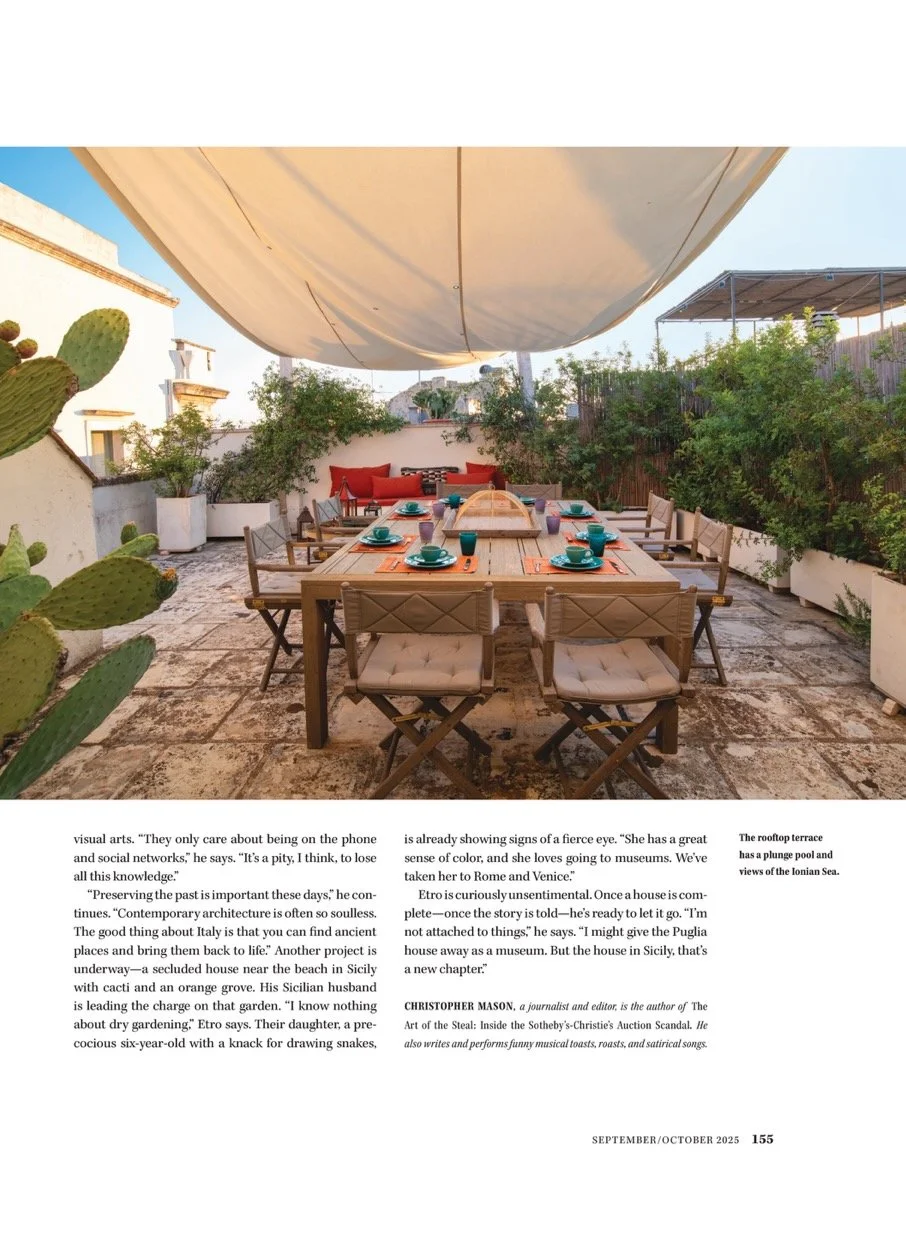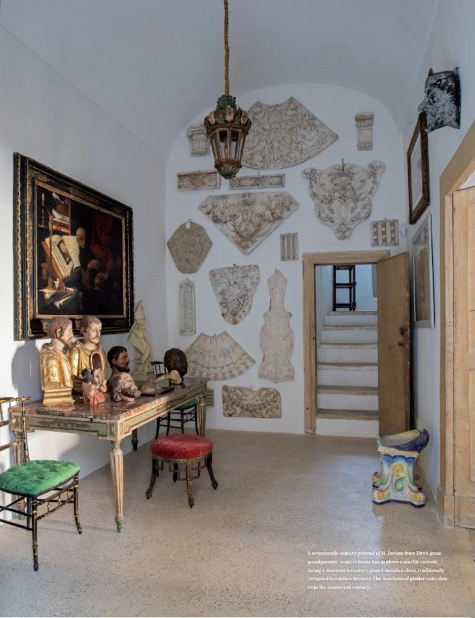 Etro is curiously unsentimental. Once a house is complete—once the story is told—he’s ready to let it go. “I’m not attached to things,” he says. “I might give the Puglia house away as a museum. But the house in Sicily, that’s a new chapter.”