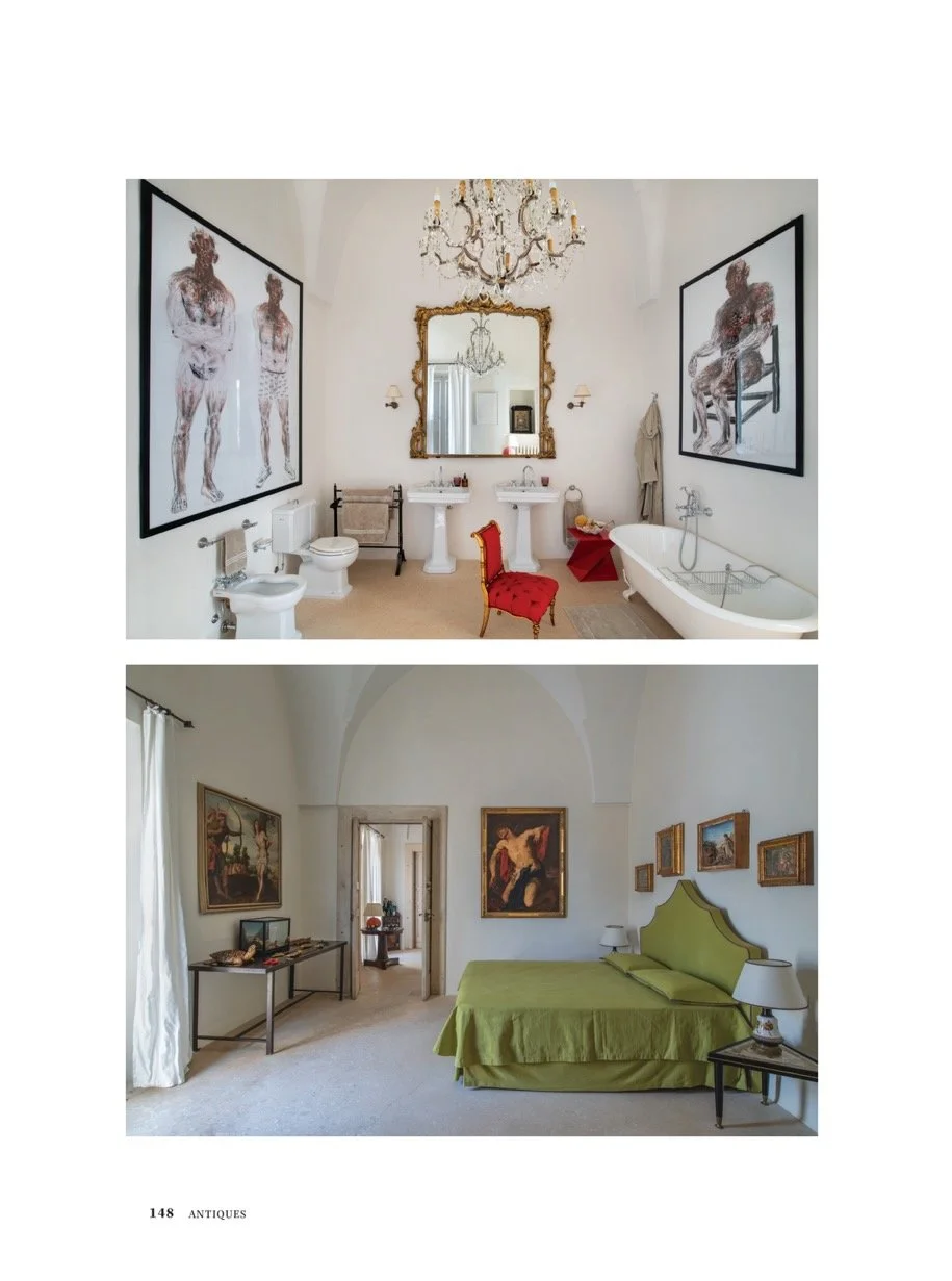 No apparitions, saintly or sinister, have been reported in Etro’s Puglian idyll. White marble nineteenth-century copies of Hellenic statues—the Borghese Gladiator by Agasias now in the Louvre (c. 100 BC) and a similarly chiseled playmate—grace a Roman console table on the pink-frescoed landing at the top of the stairs, hung with two rare eighteenth-century portraits of actors from the Comédie Française.