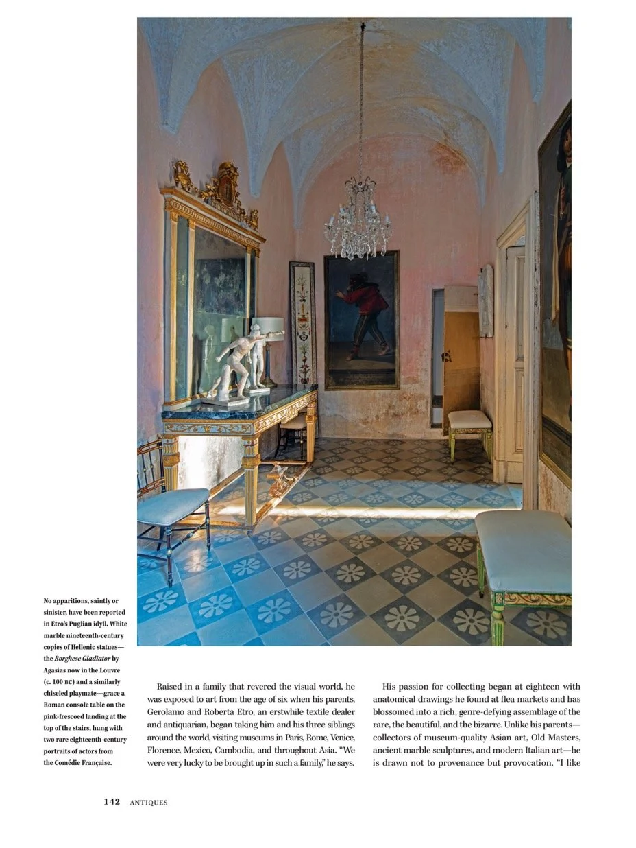 No apparitions, saintly or sinister, have been reported in Etro’s Puglian idyll. A pair of Roman gladiators (nineteenth-century copies) grace a Neapolitan console table on the pink-frescoed landing at the top of the stairs, along with two rare eighteenth-century named portraits of actors from the Comédie Française. “They’re not in good condition, but I don’t care,” he says. “Quality is important, but these are unique.”