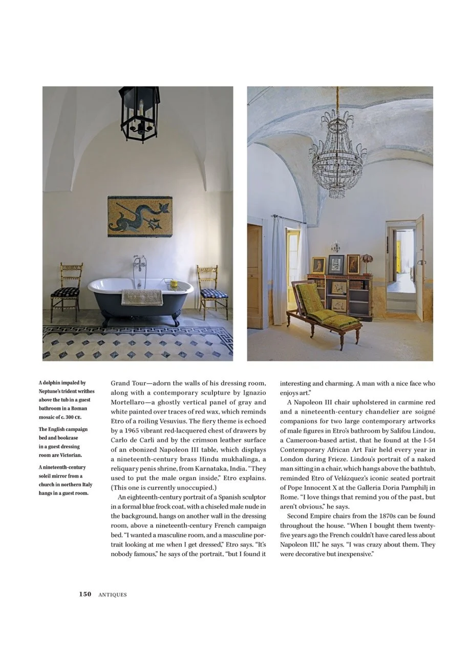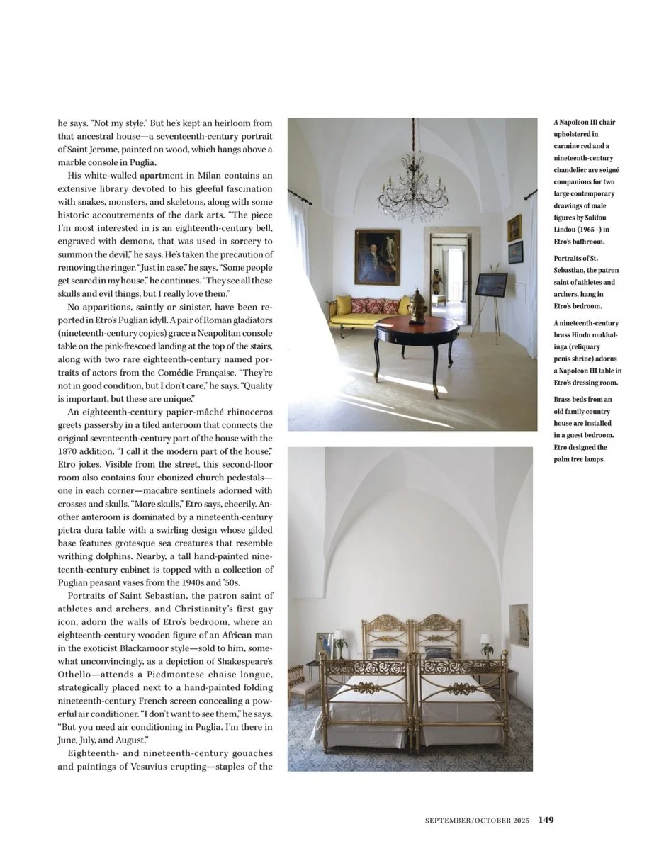 Portraits of Saint Sebastian, the patron saint of athletes and archers, and Christianity’s first gay icon, adorn the walls of Etro’s bedroom, where an eighteenth-century wooden figure of an African man in the exoticist Blackamoor style—sold to him, somewhat unconvincingly, as a depiction of Shakespeare’s Othello—attends a Piedmontese chaise longue, strategically placed next to a hand-painted folding nineteenth-century French screen concealing a powerful air conditioner. “I don’t want to see them,” he says. “But you need air conditioning in Puglia. I’m there in June, July, and August.”
