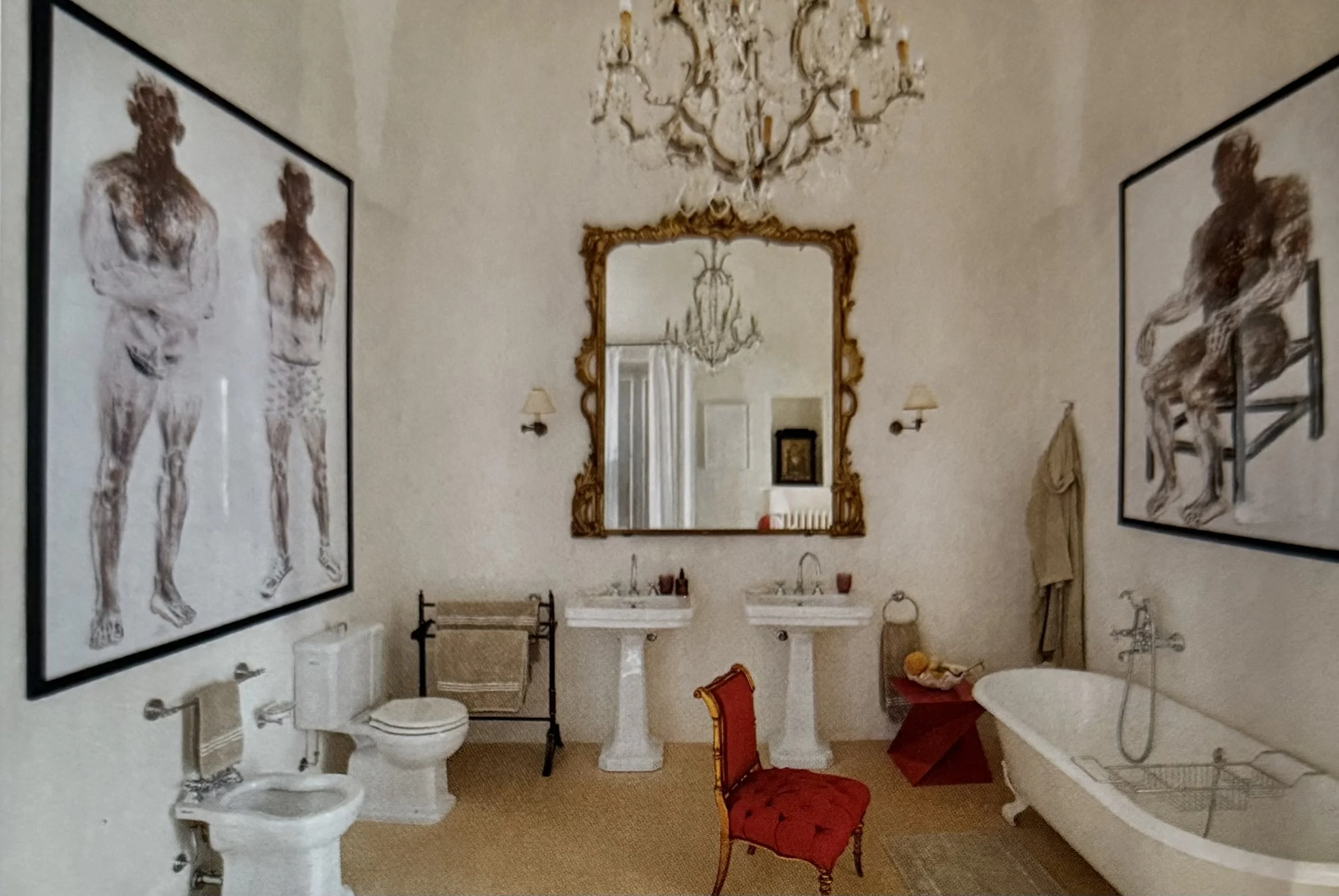 A Napoleon III chair upholstered in carmine red and a nineteenth-century chandelier are soigné companions. for two large contemporary drawings of male figures by Salifou Lindou (1965–) in Etro’s bathroom.