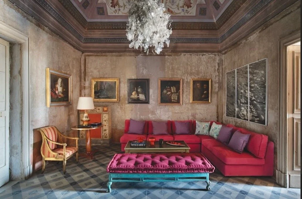 “Time stood still,” says the sixty-two-year-old eldest scion of the eponymous Milanese fashion dynasty known for its luxurious profusion of paisley, founded by his father in 1968. The house’s frescoed walls and soaring eighteen-foot vaulted ceilings—in gorgeous shades of violet, pink, and ocher—were faded but intact. “I wanted to keep it as it was, even the shadows of the furniture on the walls,” he adds. “My architect told me, ‘You’re crazy!’”