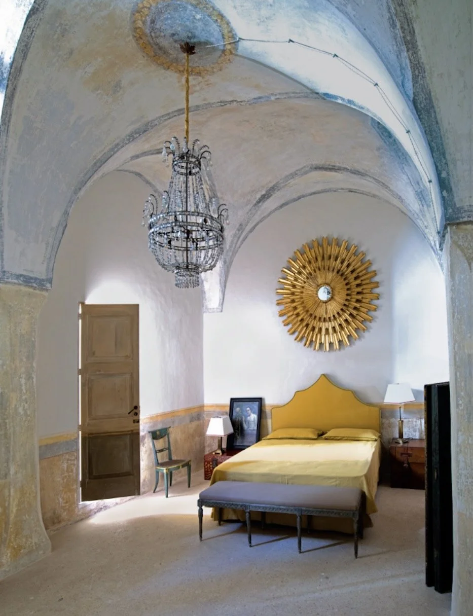 A nineteenth-century soleil mirror from a church in northern Italy hangs in a guest room.