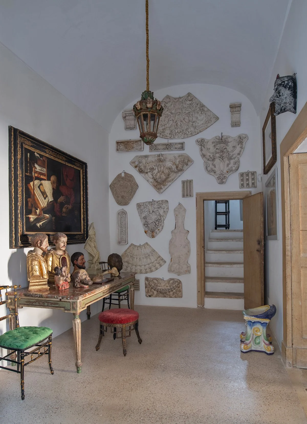 An eighteenth-century papier-mâché rhinoceros greets passersby in a tiled anteroom that connects the original seventeenth-century part of the house with the 1870 addition. “I call it the modern part of the house,” Etro jokes. Visible from the street, this second-floor room also contains four ebonized church pedestals—one in each corner—macabre sentinels adorned with crosses and skulls. “More skulls,” Etro says, cheerily. Another anteroom is dominated by a nineteenth-century pietra dura table with a swirling design whose gilded base features grotesque sea creatures that resemble writhing dolphins. Nearby, a tall hand-painted nineteenth-century cabinet is topped with a collection of Puglian peasant vases from the 1940s and ’50s.